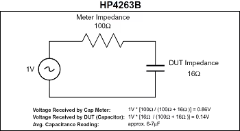 當(dāng)從測試設(shè)備中將1.0 Vrms的電壓加到電容器時(shí),電壓在儀表阻抗和電容器阻抗之間被分壓。對于HP4263B測試儀,其阻抗保持為100 Ω不變(圖1),而對于HP4278A測試儀,計(jì)算的電容器阻抗變?yōu)?.5 Ω(圖2)。結(jié)果表明,對于HP4263B測試儀,絕大多數(shù)外加電壓會降低在測試儀阻抗中,而HP4278A測試儀可以使電容器能夠接收大部分外加電壓。因此,HP4263B測試儀顯示的測量值將低于真實(shí)值。