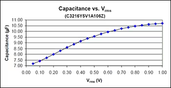 如果將測試儀表的OSC電壓設(shè)置為1.0Vrms,不能保證在電容器上施加全部外加電壓。因此,當(dāng)發(fā)現(xiàn)電容器上的電壓約為設(shè)定值的10%時(shí),也就不足為奇了(圖3)。該圖顯示了低VAC如何影響測得的電容值。
