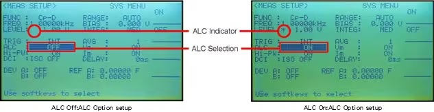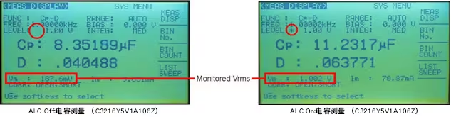 下圖展示了ALC on和off之間的差異。當(dāng)ALC功能off時(shí),電容器上的實(shí)際電壓約為1.0Vrms設(shè)定電壓的10%。當(dāng)ALC功能on時(shí),電容器上的電壓幾乎是設(shè)定電壓的100%。HP4284A具有電壓和電流等級監(jiān)視器,但還是可以使用伏特計(jì)驗(yàn)證實(shí)際電壓。