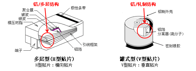 2. “罐式”型(V型貼片):這種類型的電容器采用了軋制鋁材結構作為陽極,同樣使用固體導電高分子作為陰極。與H型貼片相比,V型貼片的結構更為簡單,通常具有較大的容量和較高的電壓承受能力。然而,由于其體積較大,不太適合用于對空間要求較高的場合。